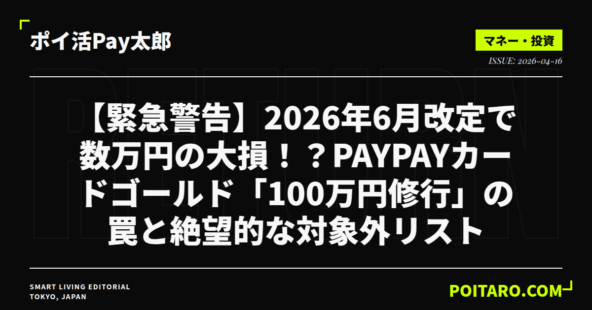 この記事では、2026年6月2日から順次適用されるPayPayカード ゴールドの改定内容を筆者が徹底解剖します。絶対に知っておくべき「対象外リスト」と、あなたが今すぐ解約・ダウングレードすべきかどうかの「損益分岐点」を明確に突きつけます。手遅れになる前に、必ず最後まで目を通してください。